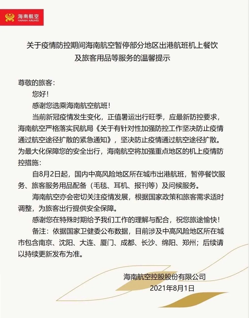 新海南客戶端、南海網、南國都市報8月2日消息(記者 劉洋)8月2日上午,海南航空發布公告,海航將加強重點地區機上疫情防控措施,自8月2日起,國內中高風險地區所在城市出港航班,暫停餐飲服務、旅客服務用品配備(毛毯、耳機、報刊等)及問候服務。具體公告如下: