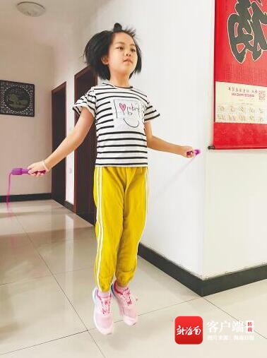 海口小學生暑期在家里跳繩。