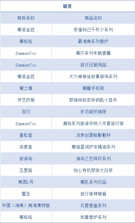 椰派金匠·茶逢知己千杯少系列、椰格格·最海南系列香爐、SummerCoo·椰貝系列車載香薰、SummerCoo·旅行日拋用品、椰派金匠·大力神神話故事銀飾系列、椰之情·椰雕手機架、傳藝織娘·黎錦拜釦吉祥鑰匙小掛件、吉貝·多功能織錦帶、SummerCoo·潮島系列旅游收納八件套旅行裝、喜松堂·淺表創面貼敷敷料、堯香堂·椰油盈潤護發精油系列、旅游島·海島之戀耳環系列、五里路·怡心有機黎族大白茶、南國i號·椰乳系列飲品、壹圣·旅行裝辣椒醬、中國(海南)南海博物館·沉香香盒系列、椰格格·如意香爐系列共17套(件)獲得銀獎。