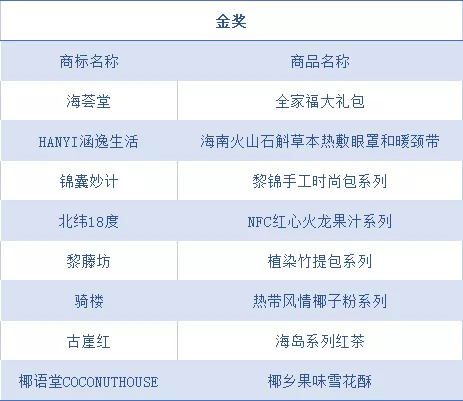 海南選送的海薈堂·全家福大禮包、HANYI涵逸生活·海南火山石斛草本熱敷眼罩和暖頸帶、錦囊妙計·黎錦手工時尚包系列、北緯18度·NFC紅心火龍果汁系列、黎藤坊·植染竹提包系列、騎樓·熱帶風情椰子粉系列、古崖紅·海島系列紅茶、椰語堂COCONUTHOUSE·椰鄉果味雪花酥共8套(件)作品脫穎而出,獲得金獎。