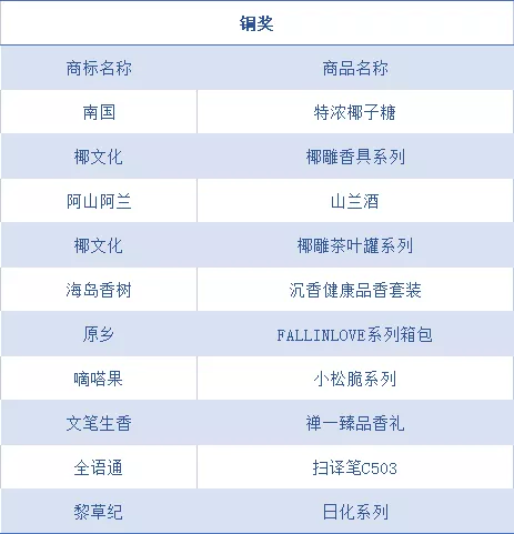 南國·特濃椰子糖、椰文化·椰雕香具系列、阿山阿蘭·山蘭酒、椰文化·椰雕茶葉罐系列、海島香樹·沉香健康品香套裝、原鄉·FALLINLOVE系列箱包、嘀嗒果·小松脆系列、文筆生香·禪一臻品香禮、全語通·掃譯筆C503、黎草記·日化系列共10套(件)獲得銅獎。