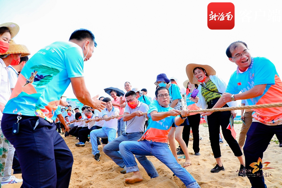 沙灘趣味運動會拔河項目比賽現(xiàn)場。