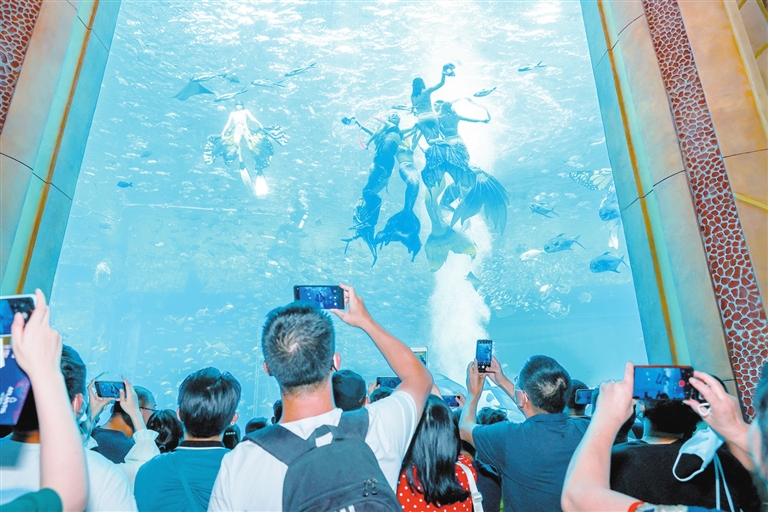 10月3日,游客在三亞·亞特蘭蒂斯失落的空間水族館觀看美人魚表演并用手機記錄精彩瞬間。 三亞日報記者 陳聰聰 攝