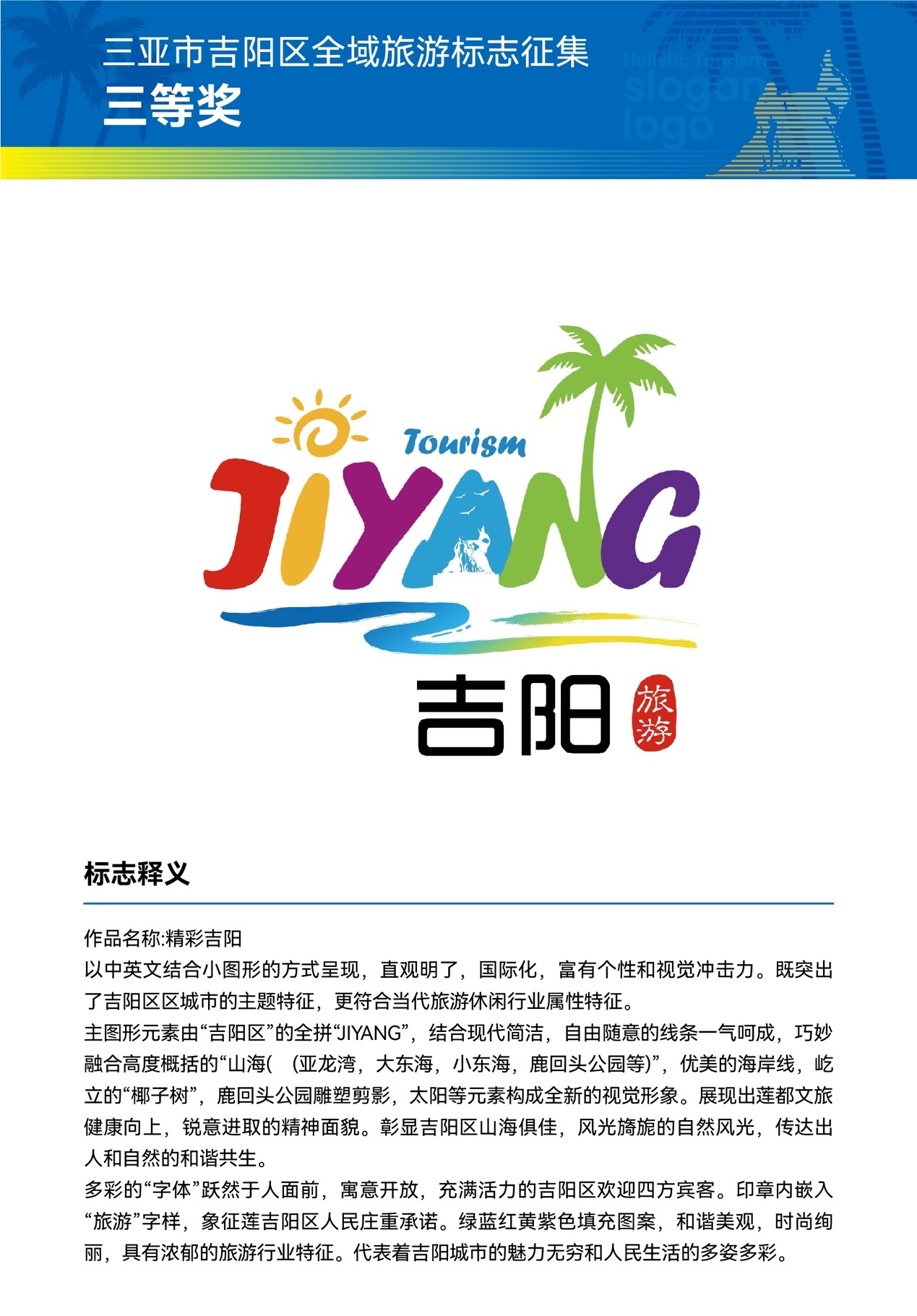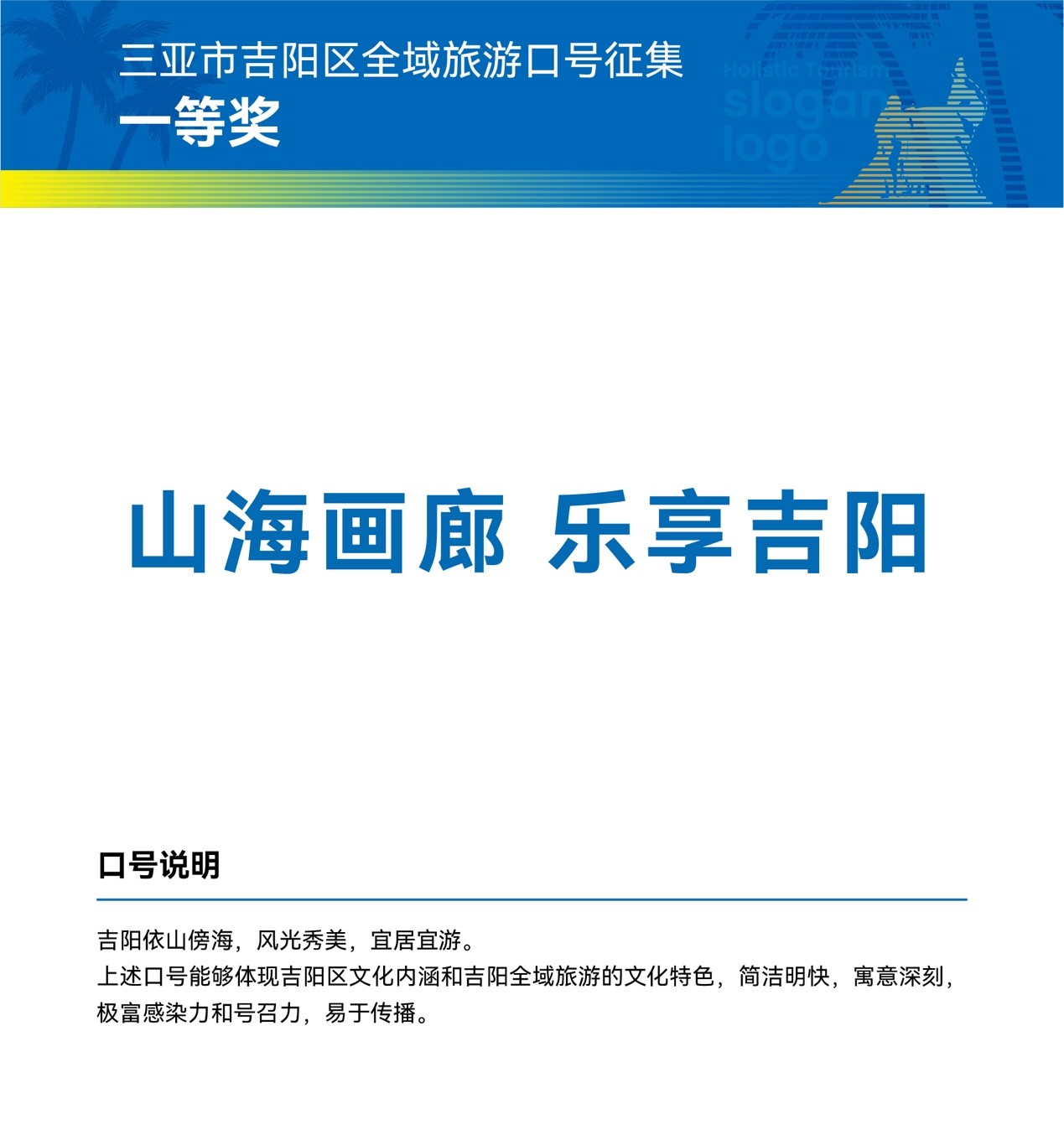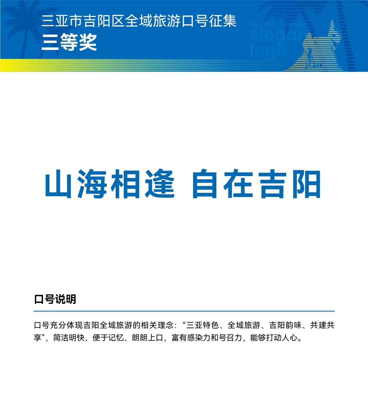 三亞市吉陽區(qū)全域旅游發(fā)展工作領(lǐng)導(dǎo)小組相關(guān)負責(zé)人表示,獲獎作品和口號均以富有吉陽特色和原創(chuàng)的設(shè)計理念,彰顯了吉陽區(qū)全域旅游的新形象。讓我們攜手共進,進一步宣傳三亞市吉陽區(qū)形象,加速提升三亞市吉陽區(qū)的知名度、美譽度、傳播力和影響力,推動區(qū)域經(jīng)濟全面發(fā)展。