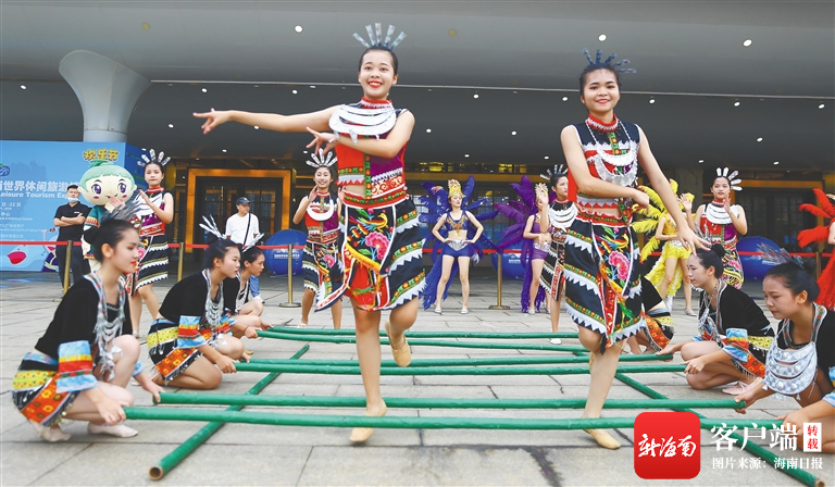 參加2020年海南國(guó)際旅游島歡樂(lè)節(jié)的女孩在歡跳竹竿舞。高林 攝