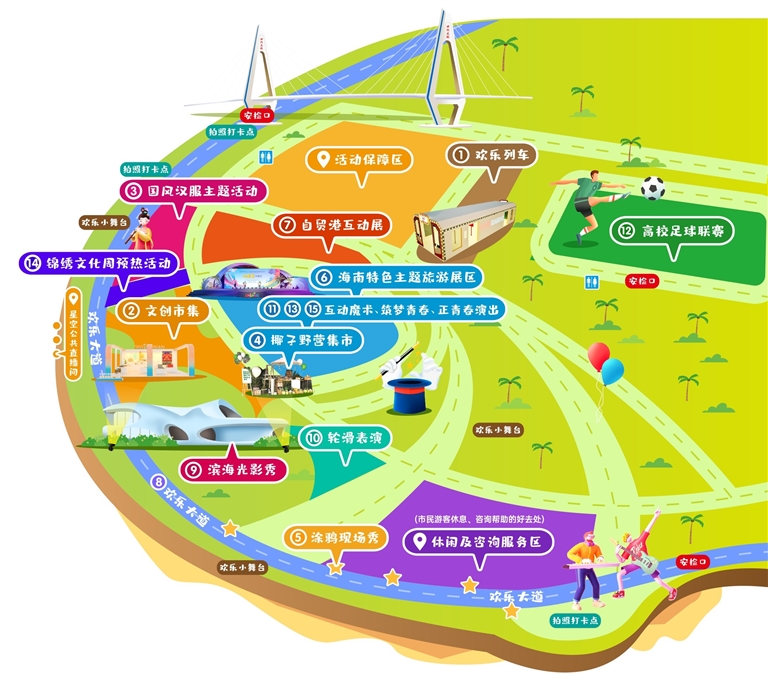 12月10日至12日舉行的椰島歡樂(lè)嘉年華中,文創(chuàng)市集、椰子野營(yíng)集市、國(guó)風(fēng)漢服主題活動(dòng)、濱海光影秀、濱海涂鴉現(xiàn)場(chǎng)秀等15項(xiàng)活動(dòng)將為大眾打造全方位的歡樂(lè)氛圍。由世紀(jì)公園濱海沿線步道打造成的繽紛歡樂(lè)大道,有街頭藝人、樂(lè)隊(duì)的輪番表演,讓觀眾盡情享受歡樂(lè)。沉浸式互動(dòng)體驗(yàn)場(chǎng)景的“歡樂(lè)列車(chē)”,更是營(yíng)造出了市民游客通過(guò)“搭乘歡樂(lè)列車(chē)”即可到達(dá)開(kāi)幕式主會(huì)場(chǎng)的感受。值得一提的是,互動(dòng)魔術(shù)魔幻劇《魔法城堡探險(xiǎn)之旅》、專(zhuān)屬定制的“歡樂(lè)海島·椰椰搖”飲品和“歡樂(lè)節(jié)”雪糕,將為大眾帶去“看得見(jiàn)、摸得到、吃得上”的極致歡樂(lè)。