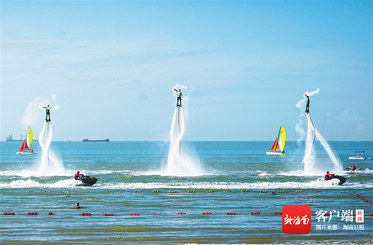 1月5日,三亞崖州灣海洋休閑運動公園投入試運營,為市民游客提供尾波沖浪、沙灘摩托艇、水上飛龍等“水上、陸地、空中”三棲娛樂項目,提升崖州灣海洋綜合旅游產品的吸引力、競爭力。圖為公園試運營當天進行的特色水上表演。