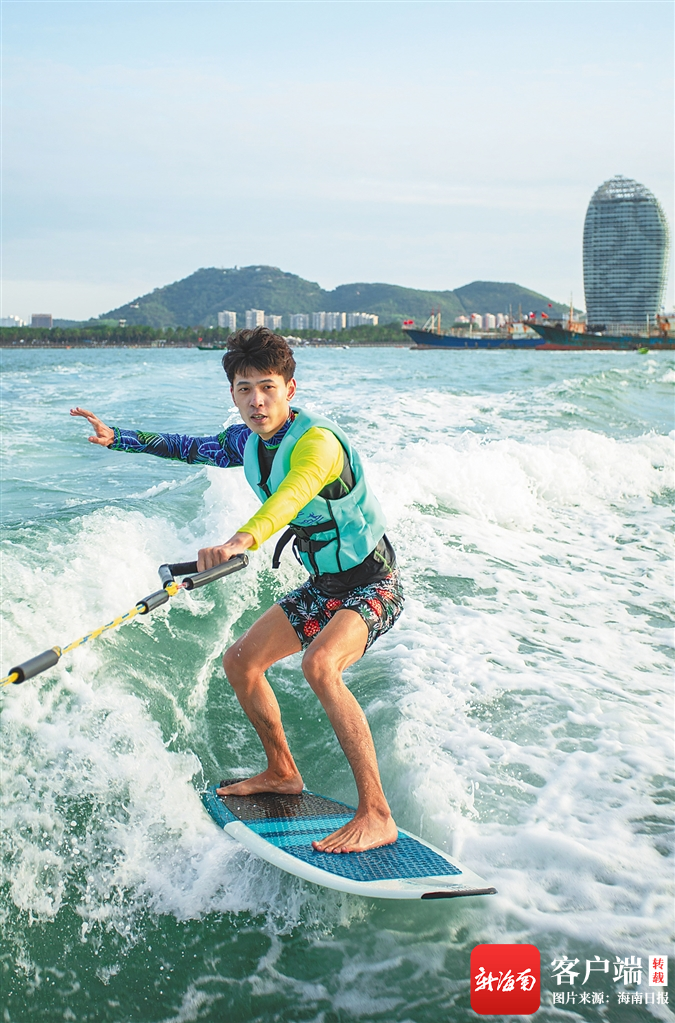 2月5日,游客在三亞灣海域體驗尾波沖浪。海南日報記者 武威 攝
