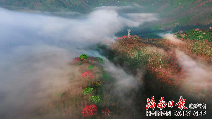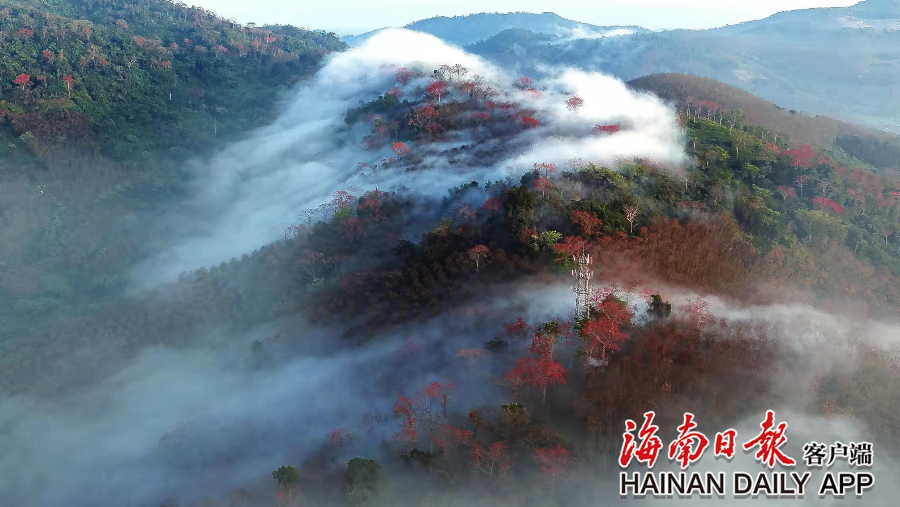 近日,白沙九架嶺木棉花開紅艷艷,朵朵嬌艷似火的木棉花在枝頭綻放,和山野、梯田遙相呼應,構成一幅美好的詩意風景畫卷。
