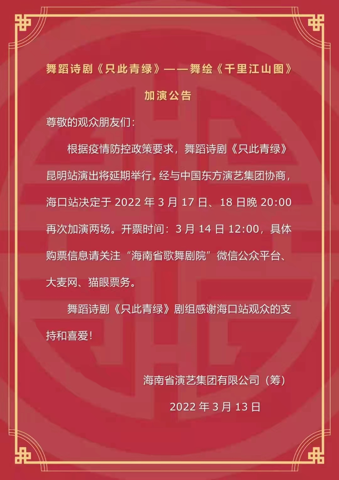 3月13日中午,記者從海南省演藝集團有限公司(籌)獲悉,舞蹈詩劇《只此青綠》——舞繪《千里江山圖》(以下簡稱《只此青綠》)將于3月17日、18日20時加演。