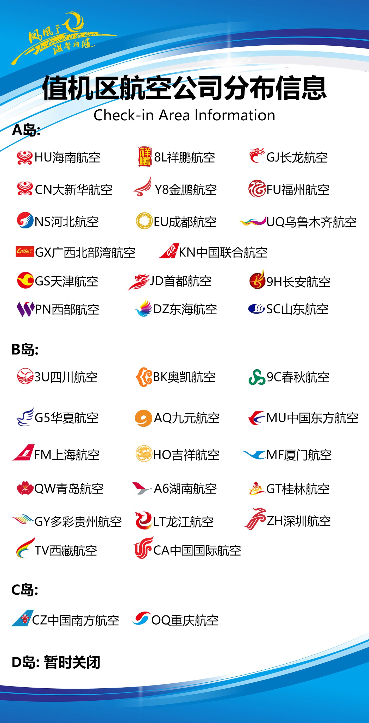 值機(jī)D島(D1-D20)暫時關(guān)閉。