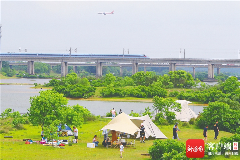 4月16日,海口市北姆堆公園畔,列車疾馳而過。經過改造后,北姆堆公園成為市民游客郊游露營好去處。 通訊員 寧遠 攝