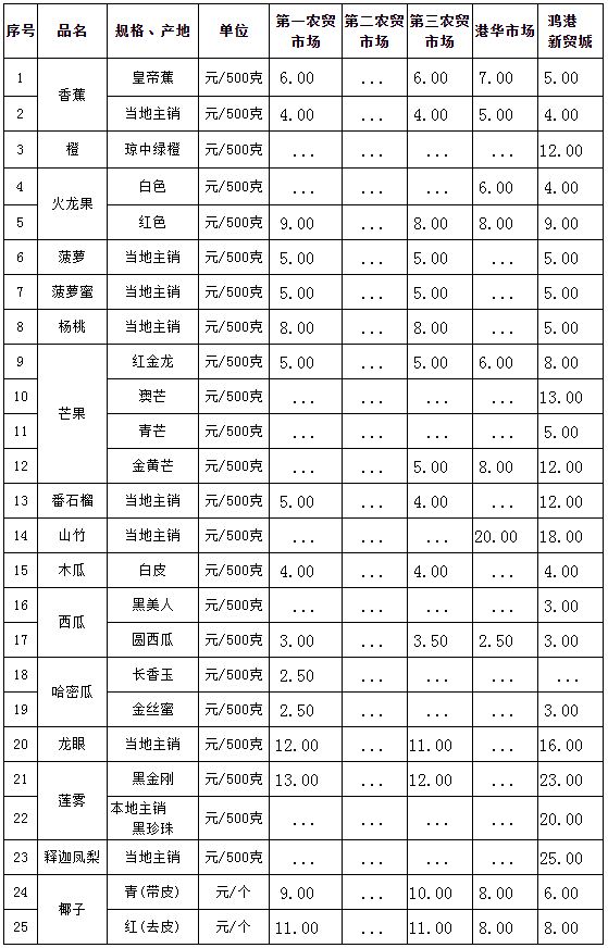 ?三亞市常見熱帶水果零售價格表