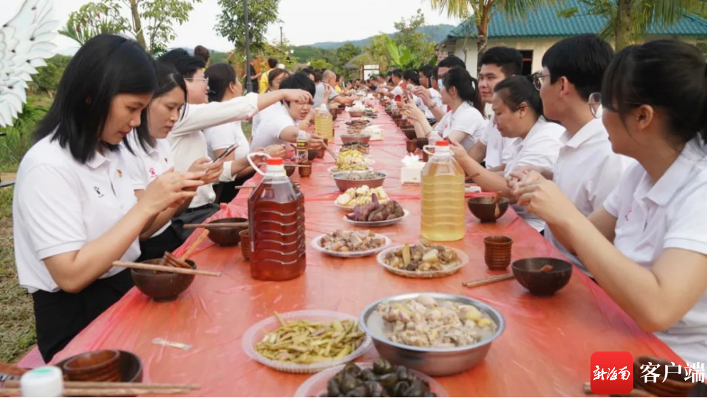 當(dāng)日18時許,長桌宴開席。游客與村民圍坐在一起,黎家兒女拿出三色飯、撈葉炒山螺、芭蕉心燉排骨、山蘭酒等美酒佳肴招待尊貴的客人;現(xiàn)場載歌載舞,一首《歡迎你到白沙來》迎接親愛的朋友,大家牽手歡聚調(diào)聲,舉杯祝愿白準(zhǔn)村的明天更加美好、走向輝煌。