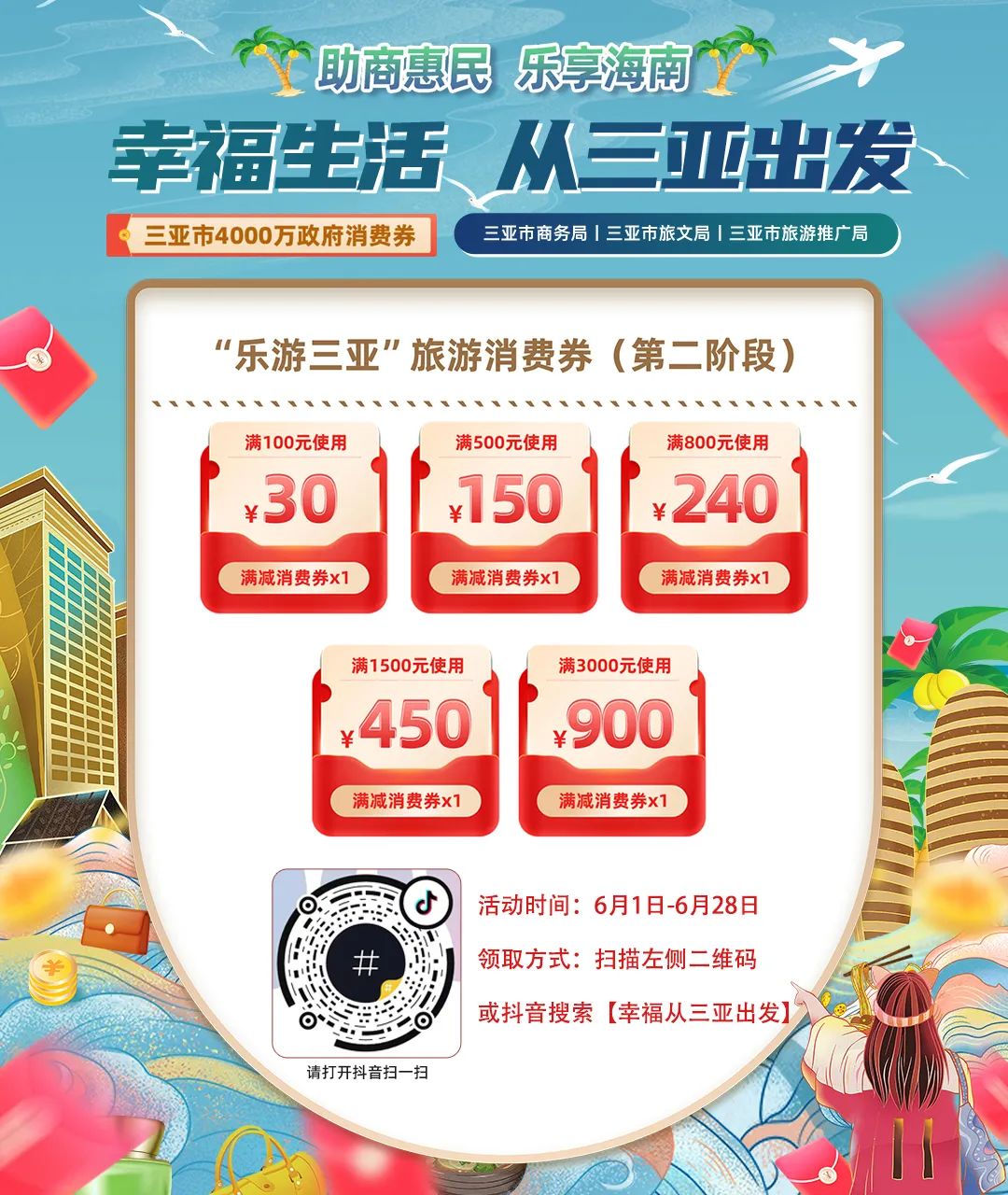 此外,“樂游三亞”旅游消費券第二階段活動在抖音平臺上線,活動時間為6月1日至6月28日,消費券包括滿100元減30元、滿500元減150元、滿800元減240元、滿1500元減450元、滿3000元減900元等,消費券有效期以平臺券面展示信息為準(zhǔn),全國游客與三亞市民均可使用。