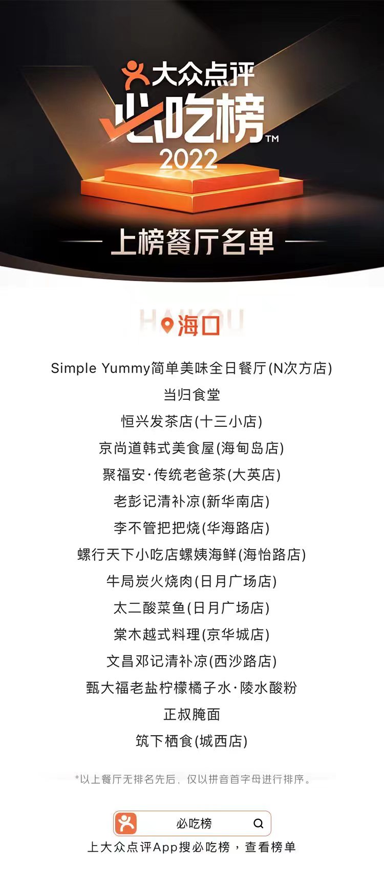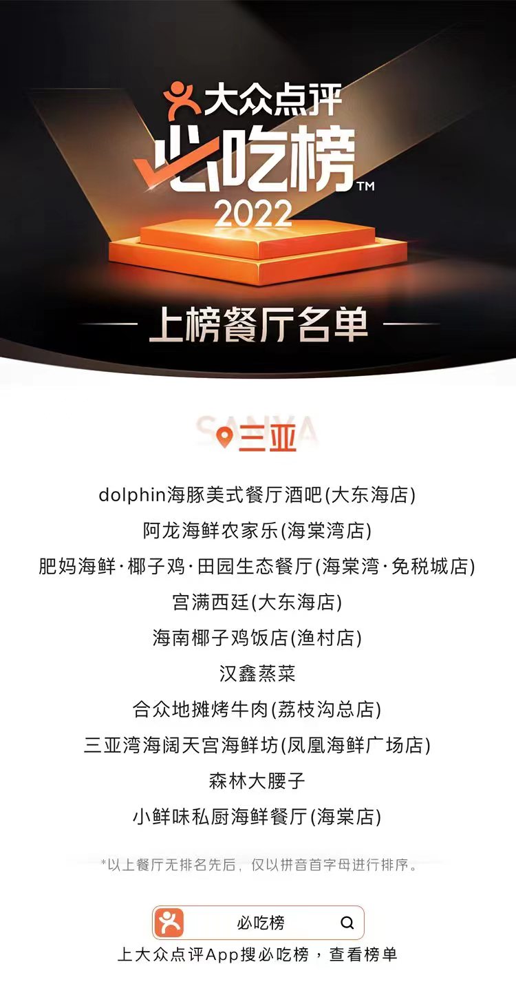 新海南客戶端、南海網、南國都市報6月22日消息(記者 任桐 實習生 姚詩瑞)6月22日,大眾點評正式發布2022年“必吃榜”,全國57城1482家優質餐廳脫穎而出。其中,海南共有25家餐廳上榜,???5家,三亞10家。據悉,大眾點評“必吃榜”已經是第六年發布。