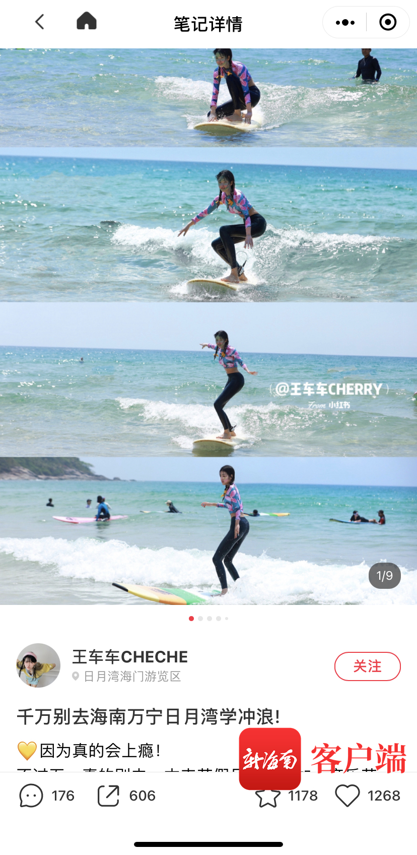 “千萬別去海南萬寧日月灣學(xué)沖浪,因?yàn)檎娴臅?huì)上癮!”在國內(nèi)某知名社交分享平臺(tái)上,“王車車”秀出自己在萬寧沖浪的大片以及游玩攻略,獲得上千的收藏和點(diǎn)贊。劃水、越浪、轉(zhuǎn)板、抓浪……在萬寧日月灣海岸線上,像“王車車”一樣與海搏擊、乘風(fēng)破浪的人并不在少數(shù),岸邊是各類沖浪店、民宿旅館、咖啡餐飲,讓人目不暇接,大多數(shù)店鋪門前都掛著沖浪教學(xué)、沖浪項(xiàng)目的價(jià)目宣傳。