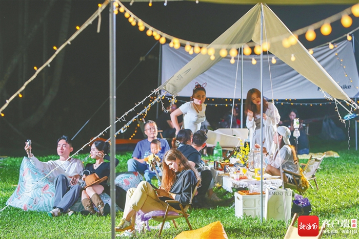 星空為幕,大地為營。10月29日傍晚,在呀諾達(dá)雨林文化旅游區(qū)的寬闊草坪上,紅火露營活動(dòng)拉開帷幕?,F(xiàn)場分為露營區(qū)、電影區(qū)和天幕區(qū)。親子、情侶、車友結(jié)伴出行,許多露營愛好者們共聚于此,共同享受愜意的時(shí)光。星空電音派對、星空電影院、自助燒烤、“DIY”紅毛丹特飲、“盲盒”禮物交換……當(dāng)晚的潮玩活動(dòng)內(nèi)容豐富多彩,涵蓋了律動(dòng)健康、親子互動(dòng)、美食分享等多個(gè)方面。