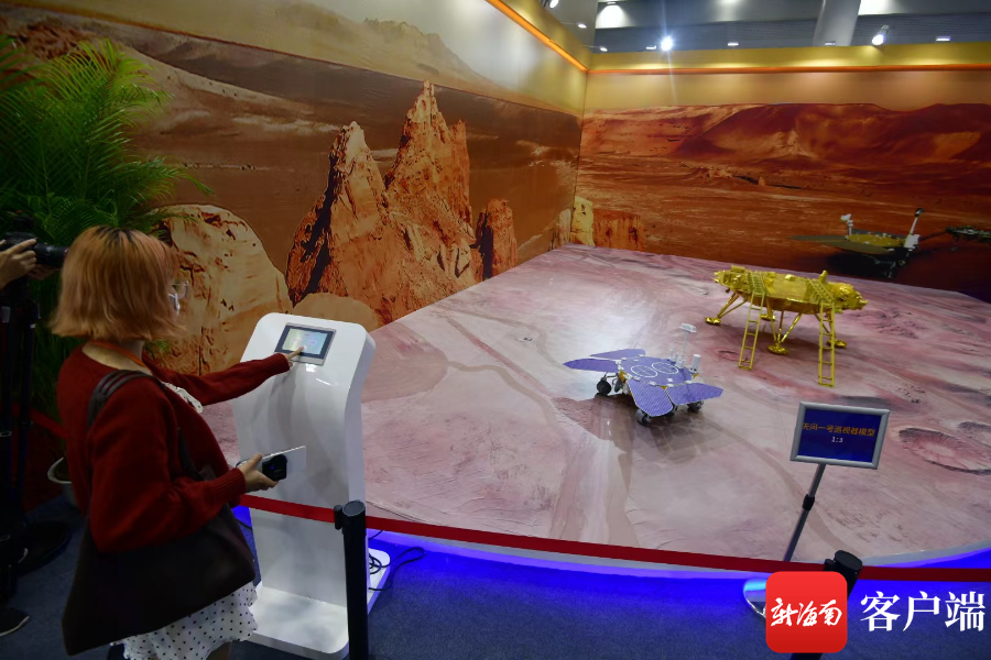 展廳內(nèi)還滾動播放嫦娥五號、神舟十三號飛船三位航天員太空之旅等航天相關(guān)視頻,展板上展示了“嫦娥五號”發(fā)射歷程、快舟系列固體運載火箭、文昌國際航天城等內(nèi)容。展廳中,“天問一號巡視器”模型前人頭攢動。觀眾通過操控一旁的互動操作臺,“天問一號巡視器”模型時而前進后退,時而左右方向轉(zhuǎn),讓觀眾在沉浸式交互中體驗航天趣味。
