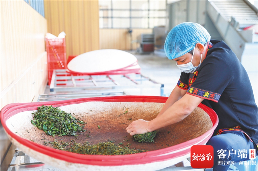 五指山市水滿鄉的一位茶農在展示手工制茶。