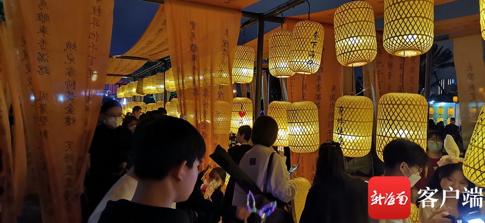 “竹外桃花三兩枝,春江水暖鴨先知。”論熱鬧,屬元宵夜里萬綠園半圓廣場旁大空地為最。這里有詩詞歌賦長廊,數(shù)量眾多的詩詞名句被印刷在長條布上,像簾子一樣成排掛在金屬架子上,架子上還掛著數(shù)量眾多的古風(fēng)古色的燈籠。人們在這里賞花燈猜燈謎。