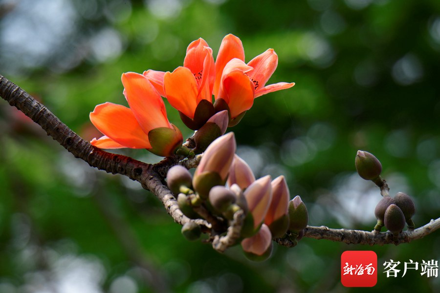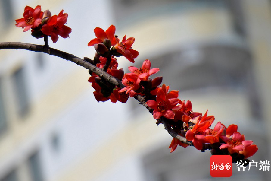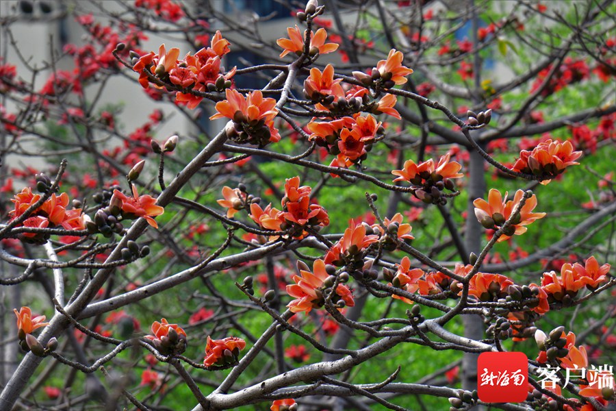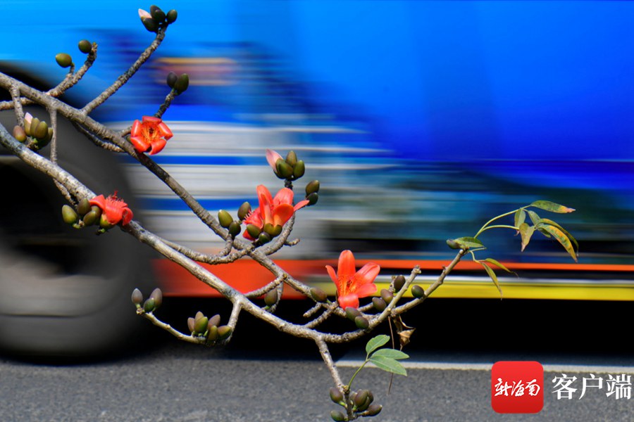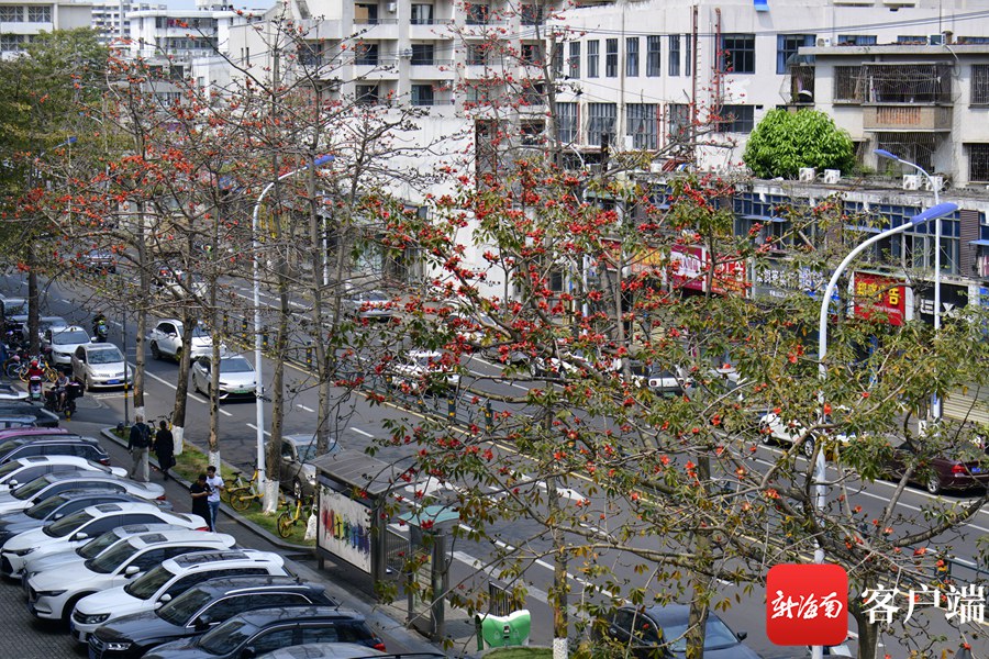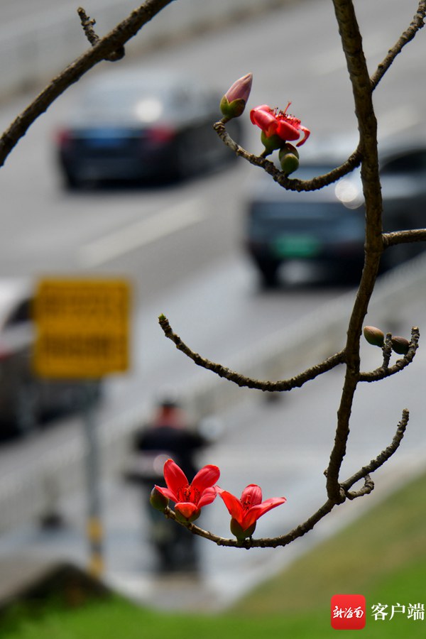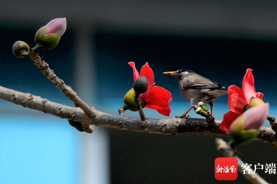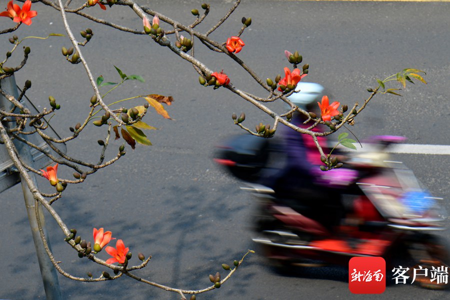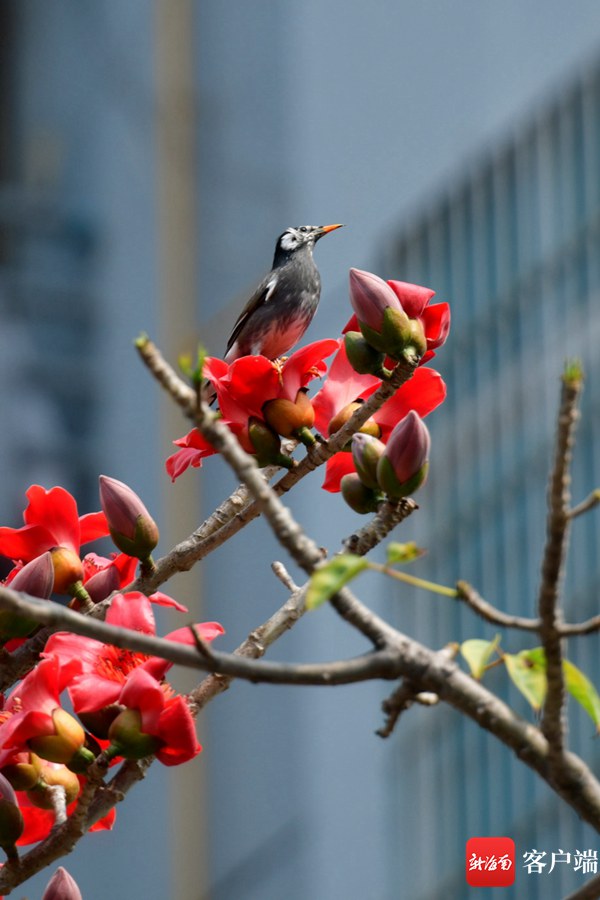 新海南客戶端、南海網、南國都市報3月8日消息 (記者 陳衛東)進入3月,海口市區的木棉花陸續盛開,其中最為集中的是五指山路。嬌艷的花朵同時引來一群群小鳥,它們在樹枝間忙來忙去找蜜吃,歡快的歌聲在木棉花間飄蕩。
