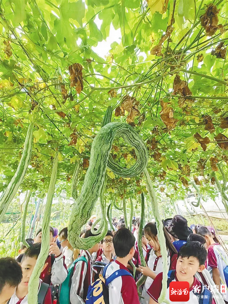 海南航天工程育種研發中心的蛇瓜吸引了不少青少年的關注。海南日報記者 劉夢曉 攝