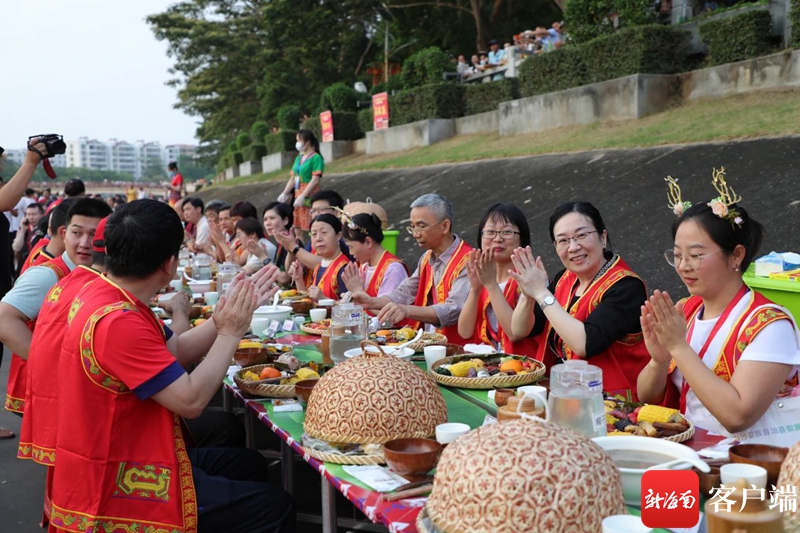 在南叉河兩岸,連綿上千米的宴桌上擺滿了五腳豬、三色飯、竹筒飯、山欄酒等當地特色菜肴,嘉賓游客市民們喝著美酒,吃著美食。席間,身著傳統民族服飾的黎族苗族同胞在舞臺上、人群中載歌載舞,傳頌著古老的民間故事和文化傳統,市民游客和著旋律舉杯高歌,共同演繹出一幅絢麗多彩的民俗畫卷。