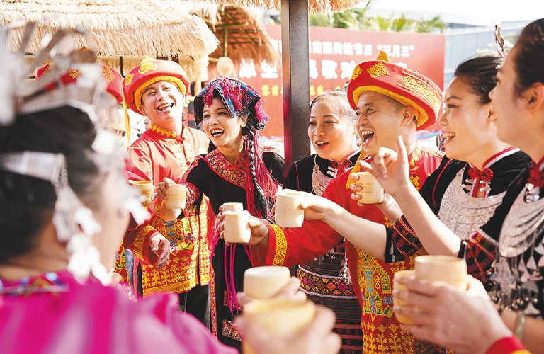 近日,在樂東等地,當地群眾舉杯歡慶“三月三”。 新華社記者 樊雨晴 攝