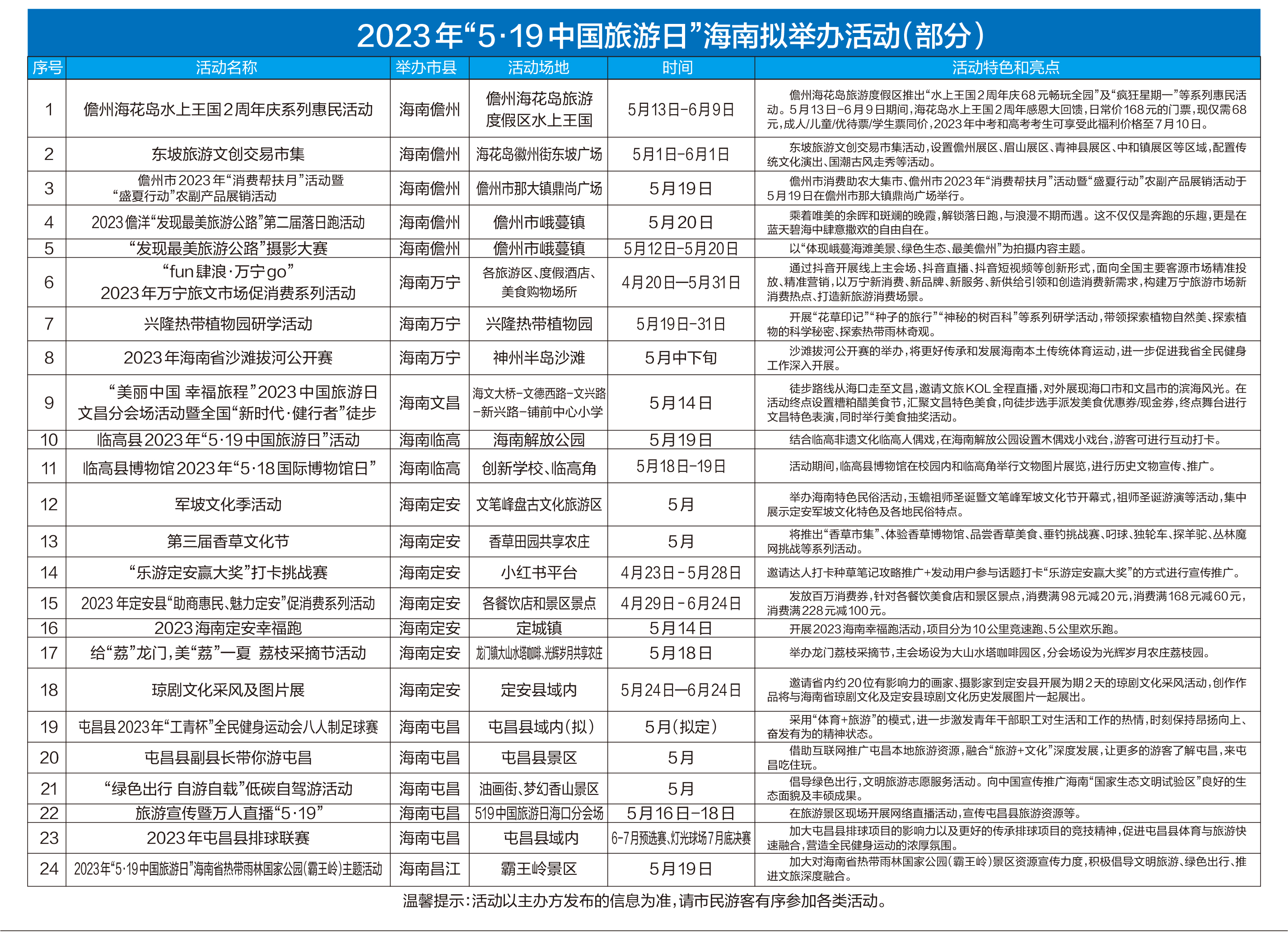 值得一提的是,海南各地推出的“5·19中國旅游日”系列精彩活動貫穿整個五月,扮靚大眾生活。