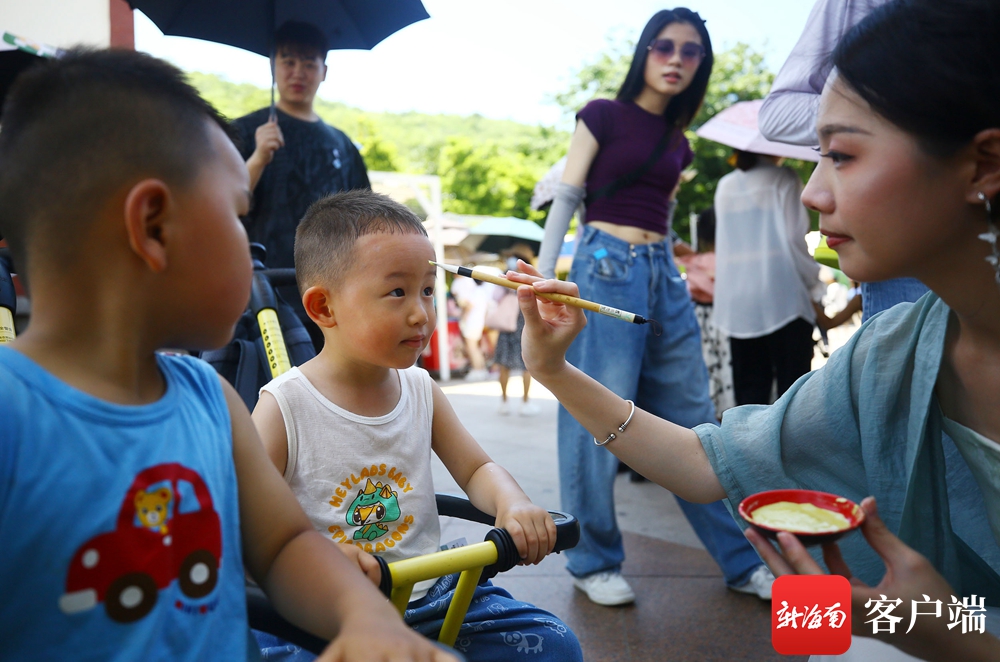 ?6月22日,市民和游客在三亞南山文化旅游區免費參加畫額抹雄黃活動,體驗端午節的傳統習俗。通訊員 陳文武 攝
