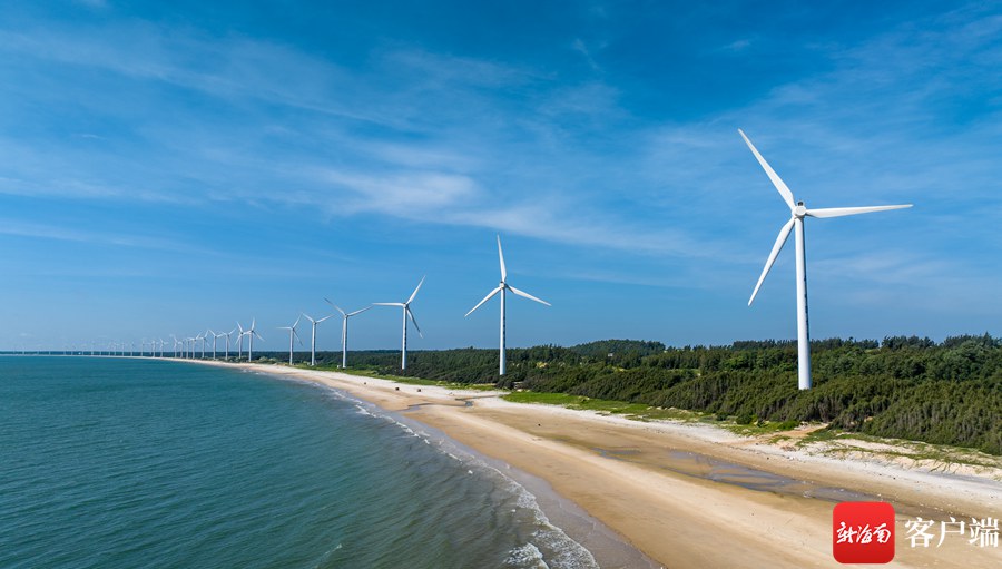 新海南客戶端、南海網6月28日消息(記者 劉洋)在海南環島旅游公路文昌木蘭灣段,白色的風車在海邊排開,藍色的海水輕輕拍打著沙灘,形成別樣的景觀,吸引眾多游客前來游玩打卡。