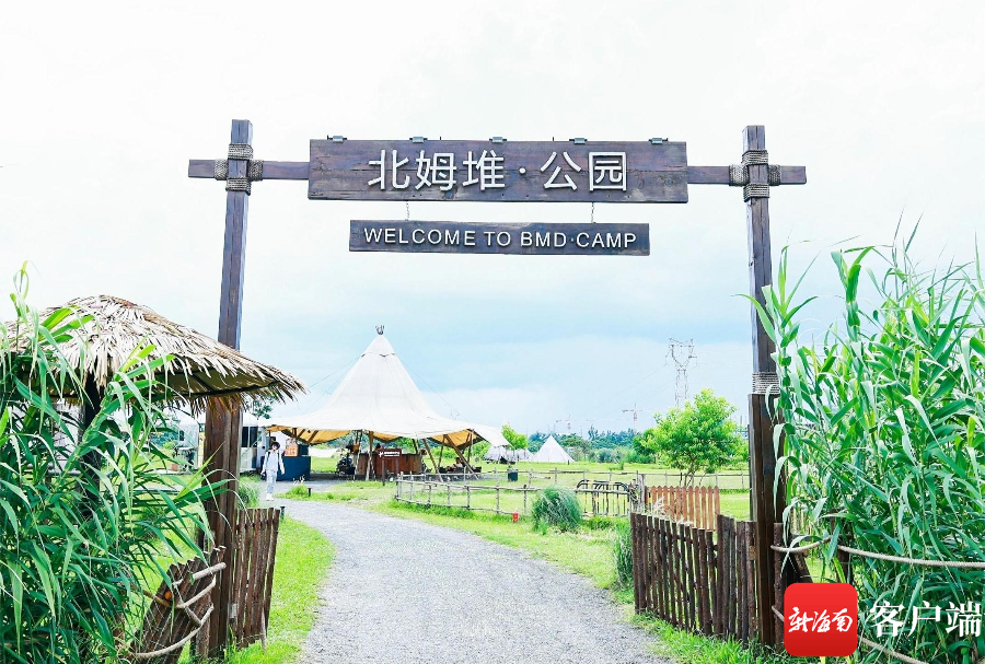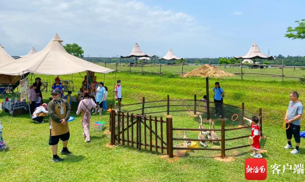 海口市郊黑山村外、南渡江畔,一塊延伸到江心的芳草沙洲,就是海口最先火起來的露營基地之一——北姆堆公園。這里有滿目嫩綠的草地,一頂頂天幕帳篷分布其間,供游客直接使用。這里也提供設備租賃,游客可以自行搭建。人們支起小桌子,鋪上野餐墊,彈琴、唱歌、拍照、享受美食,或是組隊玩飛盤、放風箏,好不自在;“兔子島”“柯爾鴨萌寵”等項目的加入,更讓北姆堆成為近郊親子游的人氣之選……
