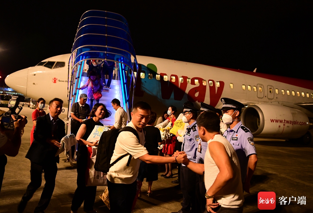 7月6日,由德威航空執飛的TW621航班搭載著125名旅客從韓國首爾抵達三亞鳳凰國際機場。記者沙曉峰 攝